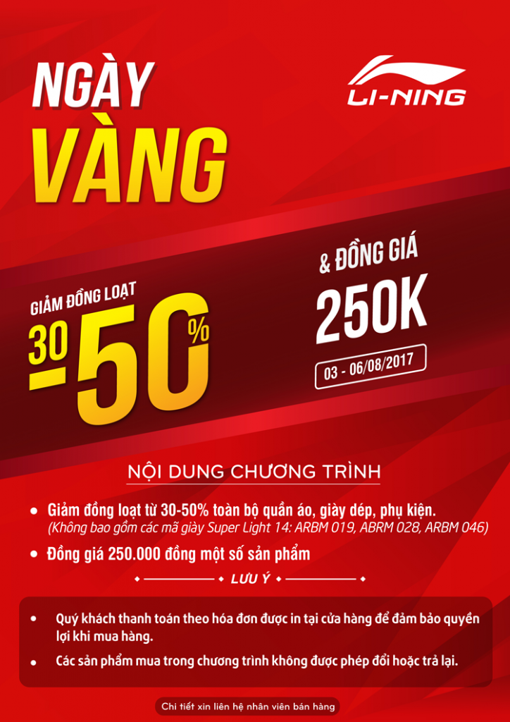 - Ngày hội giảm giá lớn nhất trong năm sẽ chính thức khởi động từ ngày 03/8 này. TẤT CẢ QUẦN ÁO, GIÀY DÉP VÀ PHỤ KIỆN sẽ được Li-Ning giảm đồng loạt từ 30 – 50%. Cùng với đó, hàng ngàn sản phẩm khác cũng được ĐỒNG GIÁ CHỈ 250K. (Riêng đối với giày Super Light 14: Khuyến mại áp dụng cho các mã ARBM019-7 và ARBM028-4; Không áp dụng cho các mã: ARBM019-1, ARBM019-3, ARBM019-4, ARBM019-5, ARBM019-6; ARBM028-1, ARBM028-3, ARBM028-5, ARBM028-6, ARBM028-8; ARBM046-4, ARBM046-5, ARBM046-9)