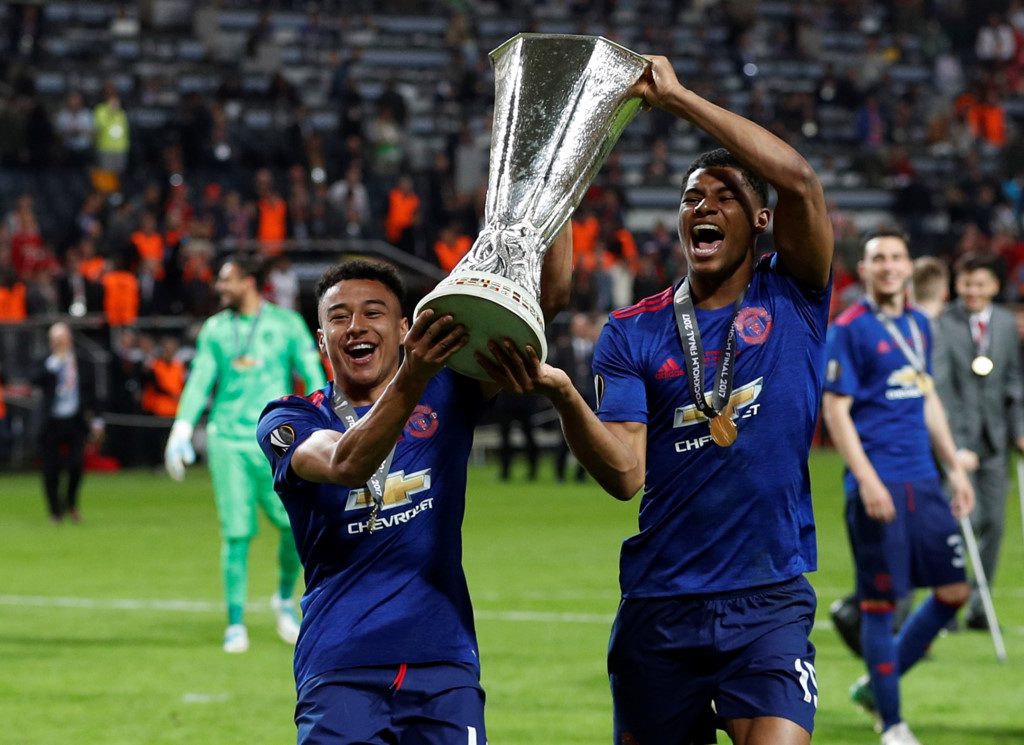 Bộ đôi người Anh Jesse Lingard và Marcus Rashford phấn khích nâng cúp chạy quanh sân vận động Friends Arena.