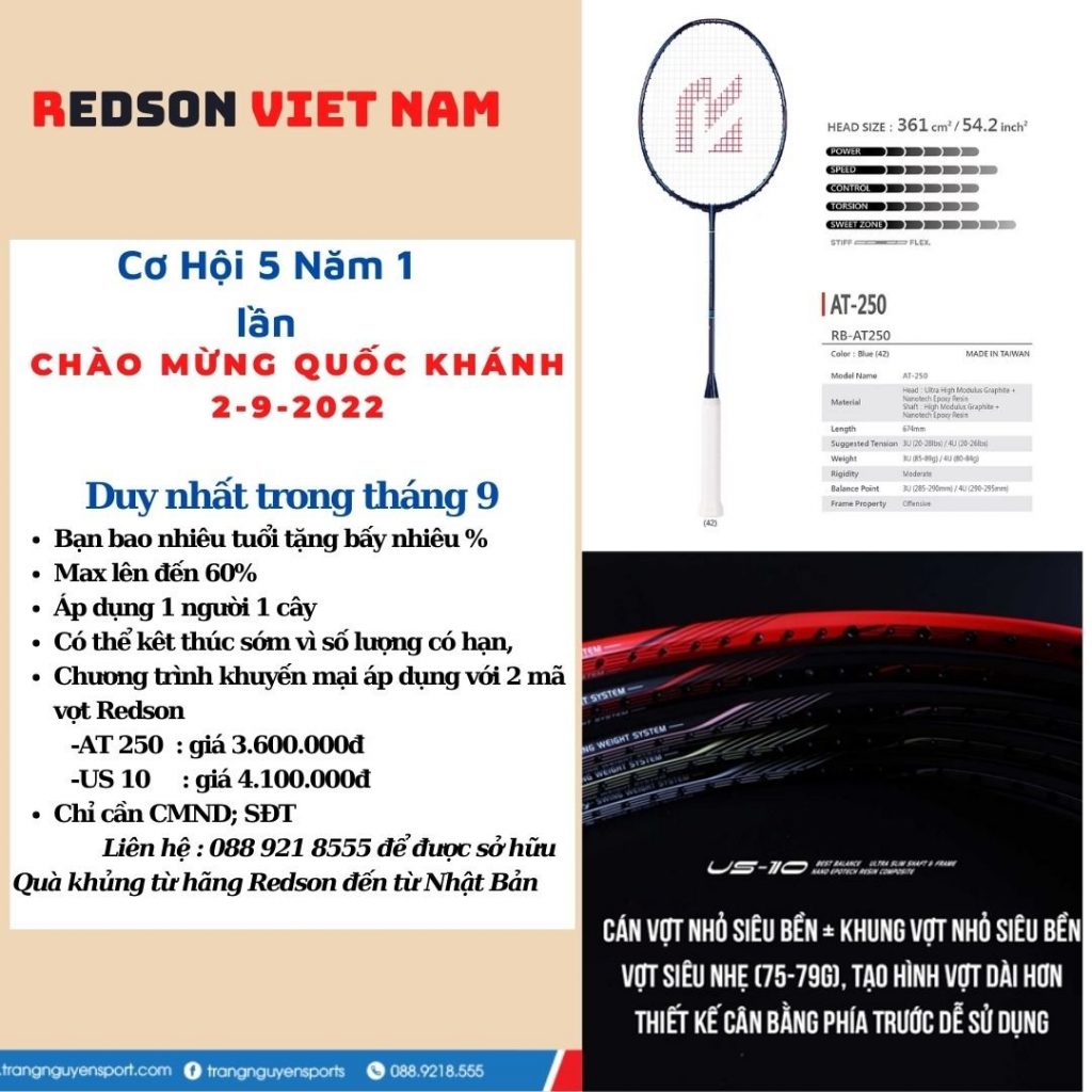 - KHUYẾN MẠI VỢT CẦU LÔNG REDSON – Nhân Dịp kỉ niệm 77 năm Ngày Quốc Khánh Việt Nam