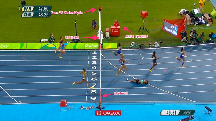 Thời gian được đo theo mốc phần trăm giây, và các vận động viên có thể chỉ chạm đích cách nhau vài phần trăm giây. Mới đây trong cuộc đua 400m nữ ở Rio 2016, vận động viên Shaunae Miller đã ngã trước vạch đích và các thiết bị xác định phần ngực của cô đã chạm vạch trước người về thứ hai, Allyson Felix chỉ 0,07 giây.