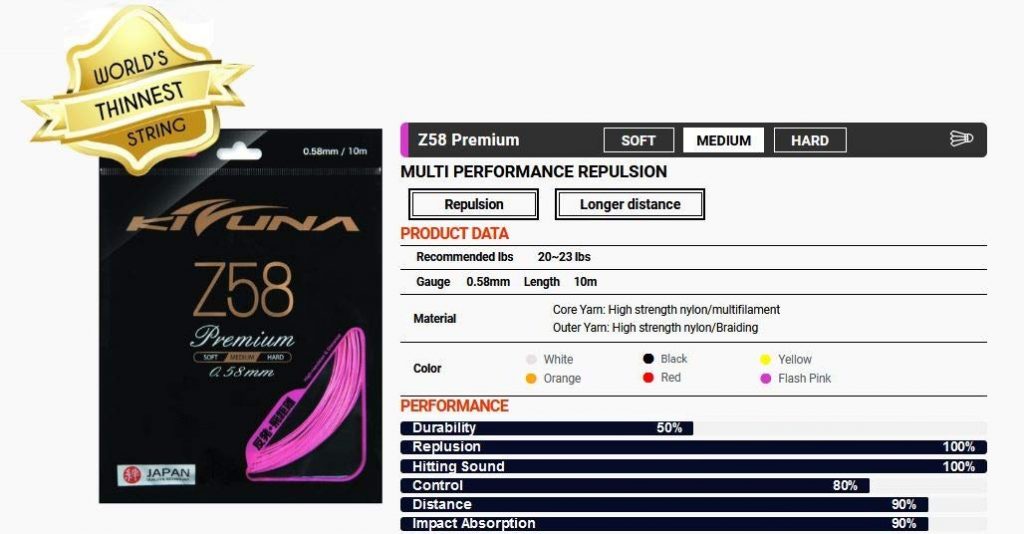 Dây cầu lông KIZUNA Japan Z58 cao cấp là loại dây nhỏ nhất của Kizuna với tiết diện 0.58mm.