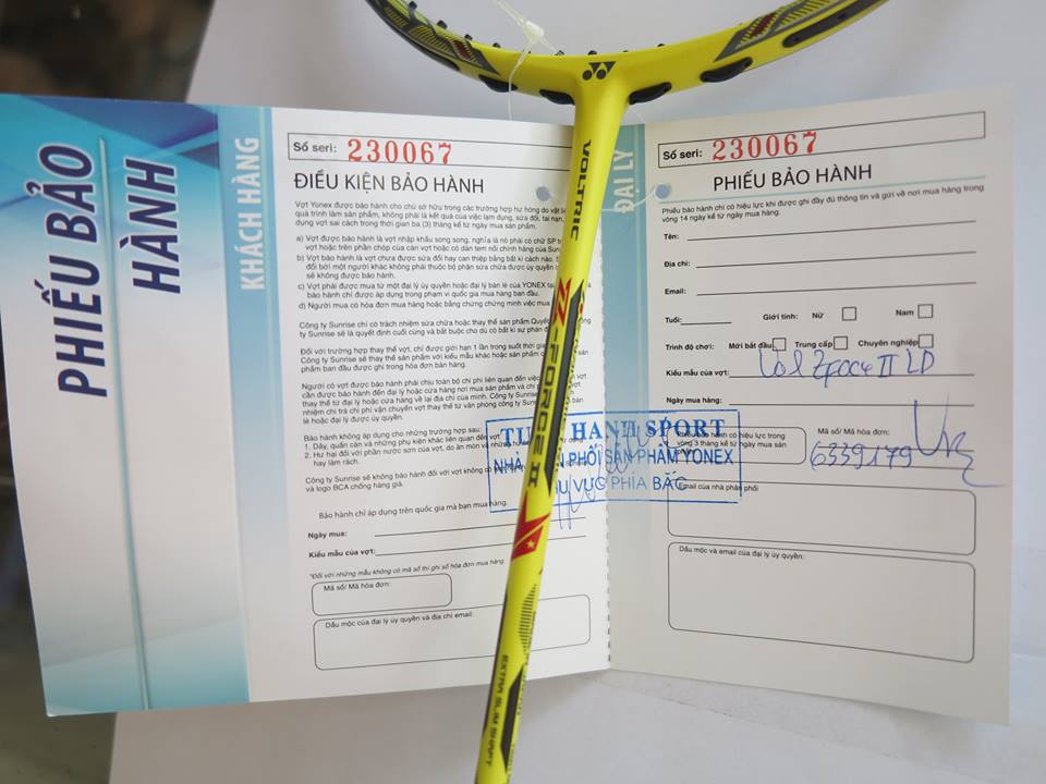 Với khách hàng mua trực tiếp sẽ được căng bằng máy điện tử, với khách hàng ở tỉnh mà phải chuyển xe thì sẽ căng khi khách yêu cầu ( thường là sẽ ko căng vì khi di chuyển sẽ không được đảm bảo tính ổn định )- Phiếu bảo hành: Tất các các cây vợt đều có phiếu bảo hành và mã Seri đúng với mã vợt, Thời lượng bảo hành là 90 ngày, Tại Trang Nguyên lựa chọn thương hiệu Yonex Tuấn Hạnh để cung cấp và phát triển.