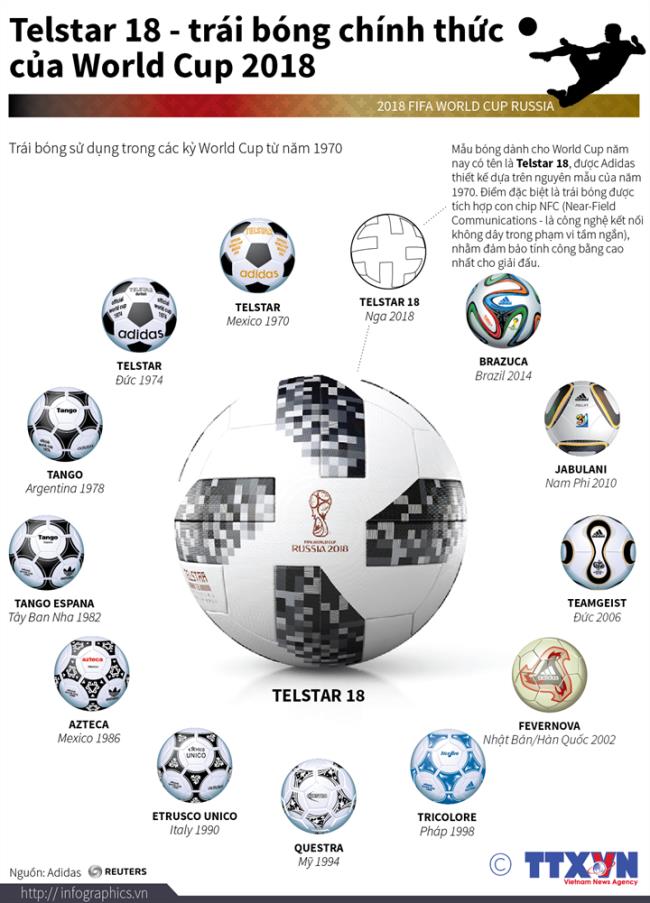 Telstar 18 – Tên trái bóng được lấy ý tưởng từ nguồn gốc xa xưa. Gần 50 năm trước tivi vẫn đen trắng, trái bóng được phối lên một màu đen để người xem có thể nhìn rõ bóng hơn. Ngày nay, công nghệ hiện đại phát triển mạnh mẽ. Telstar 18 được gắn chip điện tử kết nối không dây NFC (Near-Field Communications) trong phạm vi tầm ngắn. Công nghệ này giúp các cầu thủ nhận biết chi tiết các vị trí mình chạm bóng cũng như bóng lăn trên sân khi trải nghiệm trái Telstar 18.