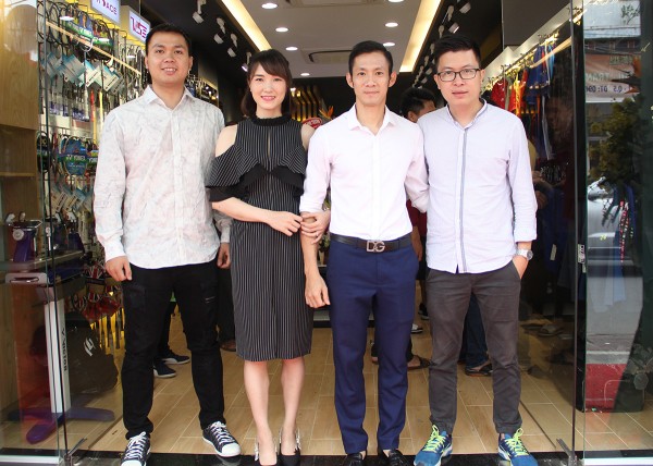 Tiến Minh và Vũ Thị Trang trong ngày khai trương cửa hàng mới.