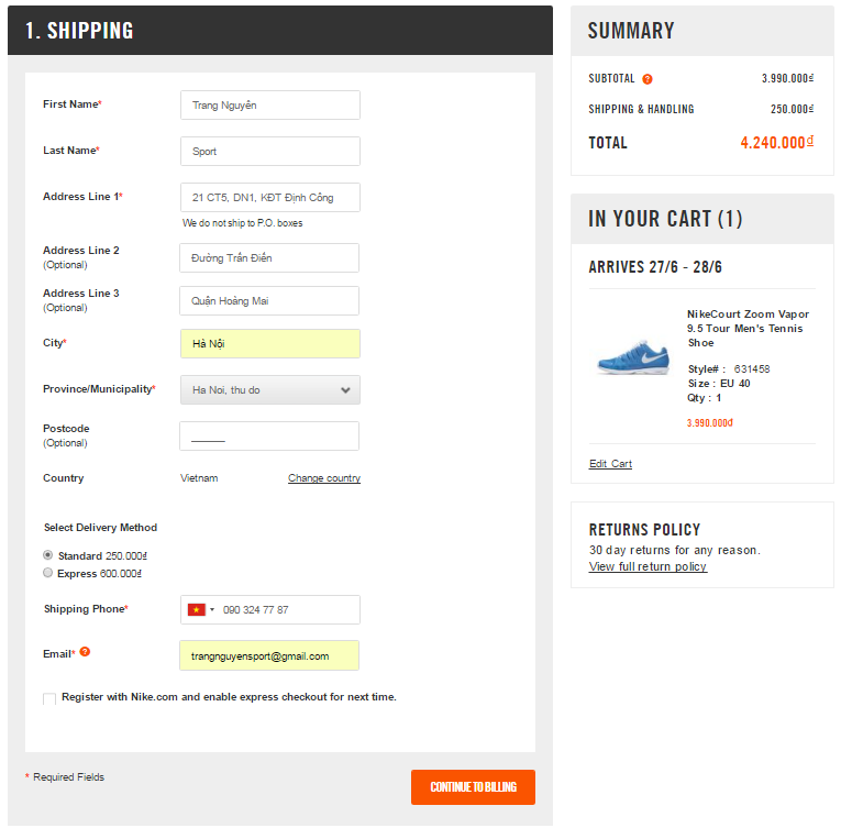 Yêu cầu bạn phải có thẻ thanh toán quốc tế (VISA, Master, American Express,…) mới đặt hàng được trên Nike.com. Không có chuyện mua hàng COD (thanh toán khi nhận hàng) như bên BH Sports của mình đâu ?