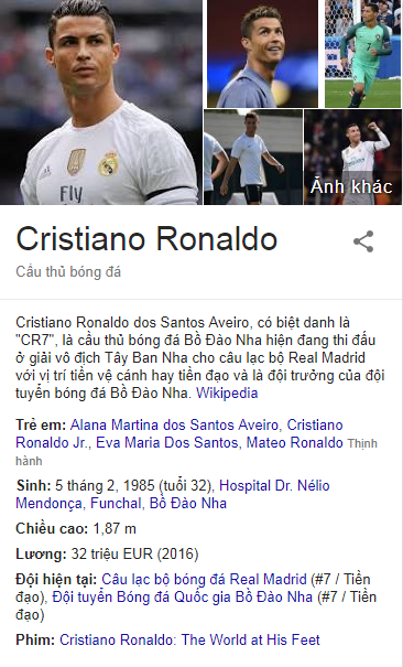 Cristiano Ronaldo dos Santos Aveiro, có biệt danh là “CR7”, là cầu thủ bóng đá Bồ Đào Nha hiện đang thi đấu ở giải vô địch Tây Ban Nha cho câu lạc bộ Real Madrid với vị trí tiền vệ cánh hay tiền đạo và là đội trưởng của đội tuyển bóng đá Bồ Đào Nha. Wikipedia