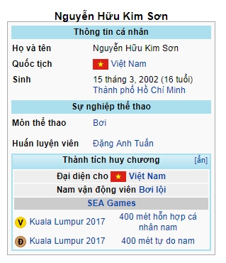 - ^ “Kim Sơn: Kình ngư 15 tuổi của Việt Nam gây địa chấn, phá kỷ lục SEA Games”. Vietnamnet. 26 tháng 8 năm 2017. Truy cập 26 tháng 8 năm 2017.