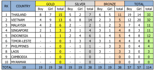 Bảng tổng sắp huy chương giải trẻ Đông Nam Á 2018.