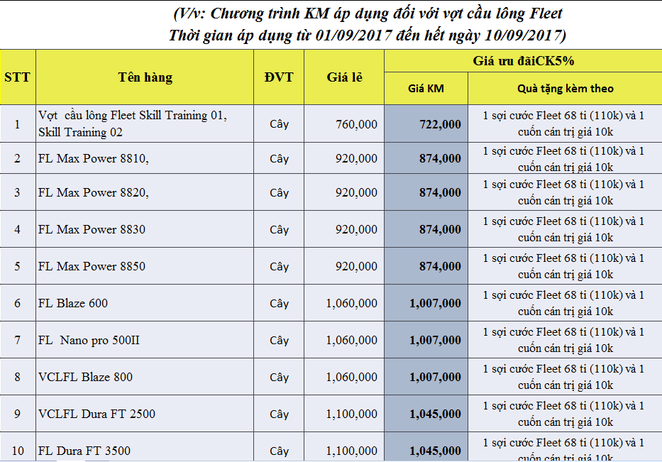 - Chương trình khuyến mại: Từ ngày 1/9 đến 10/9. Tất cả các dòng vợt cầu lông Fleet đều được khuyến mại như sau: HOÀN TIỀN 5% khi mua vợt cầu lông, Tặng 1 sợi cước cầu lông Fleet 68Ti ( Trị giá 110.000đ/ sợi ) và 1 quấn cán vợt Fleet hoặc tương ứng.
