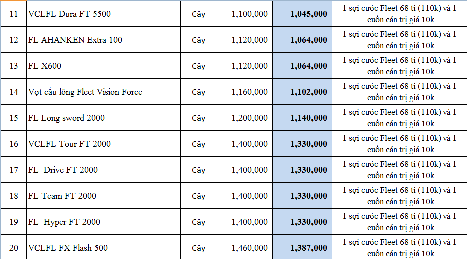 | 14 | Vợt cầu lông Fleet Vision Force | Cây | 1,160,000 | 1,102,000 |
