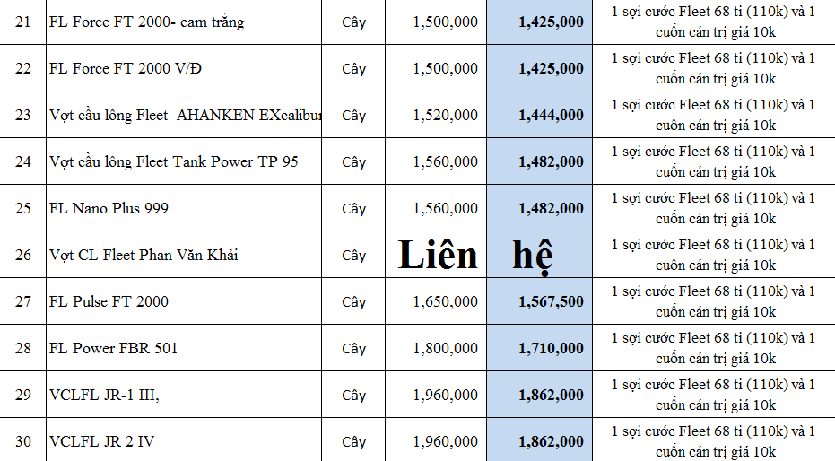 | 23 | Vợt cầu lông Fleet AHANKEN EXcalibur 70 | Cây | 1,520,000 | 1,444,000 |