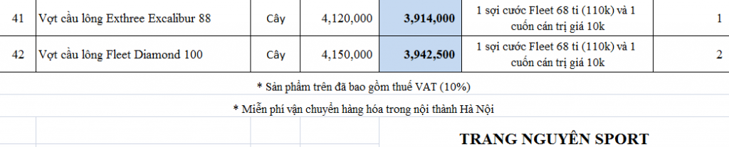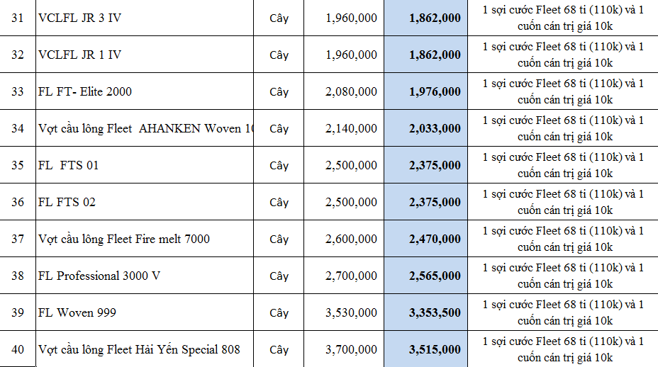 | 40 | Vợt cầu lông Fleet Hải Yến Special 808 | Cây | 3,700,000 | 3,515,000 |