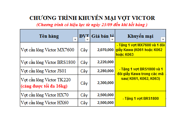 | 1 | MX7600 | Vợt cầu lông Victor MX7600 | Cây | 2,070,000 | – Tặng 1 vợt MX7600 và 1 đôi giầy Kawa (K061 hoặc K062 hoặc K063 |